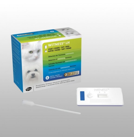 La prueba WITNESS® LH proporciona una medida semi-cuantitativa de la hormona luteinizante (LH) de los perros y gatos.La prueba se basa en la técnica inmunodifusión rápida (Rapid Inmuno Migración - RIMTM).WITNESS® LH permite poner de relieve el aumento de LH. Puesto que este incremento puede tener lugar durante un período de 24 horas, es esencial que las muestras diarias se prueban. La sangre se extraerá al día, a aproximadamente el mismo tiempo, desde el cuarto o quinto día del proestro, o cuando vaginal citología (frotis del perro) alrededor de 50% de la queratinización.Una dosificación de progesterona debe tenerse en cuenta en el primer día de la prueba para confirmar el nivel basal de la progesterona.Si se inicia la prueba después del inicio del estro, es probable que el aumento de LH ya se ha producido y no se puede identificar de forma retrospectiva.