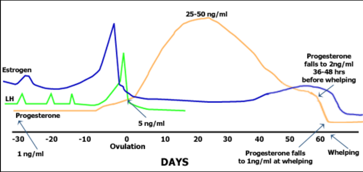 La progesterona es una hormona reproductiva que comienza a aumentar en el torrente sanguíneo justo antes de la ovulación. Antes de llegar en temporada (estro), los niveles séricos de progesterona en la perra son bajos, menos de 2ng. A medida que el ciclo continúa, los niveles de progesterona suben lentamente a un nivel de 5 ng, sobre el cual se produce la ovulación.